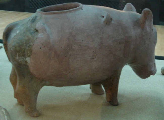 A more advanced form of hand-made, hard-fired pottery was made about 500 years later, becoming more elaborate in style and having a thinner body. It was coil built on a circular base, then paddled smooth and some were incised with horizontal lines. Moulded ornamentation was also used. Some of these vessels were polished or burnished, particularly if the clay used was exceptionally fine. An example of this period is a sizeable vessel in the remarkably realistic shape of a pig with four perforated lugs to suspend it.