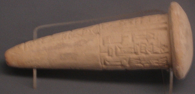 Uruk itself became a settlement around 5,000 BC as part of the Ubaid Culture. It developed as a trading centre that was, at that time, on the river Euphrates. It grew to be a large city covering some 6 sq km, with a city wall 9.5 km long, and by about 3,300 BC it had a population of around 40,000 people. As with most Sumerian cities many religious buildings were erected between 3,400 and 2,900 BC. A unique mosaic-like technique was used on buildings in Uruk and other cities, based on conical-shaped, ceramic “nails” some 3-8” long with 2-5” diameter heads embedded closely together in the mud-brick wall surface. The blunt outer ends were painted red, black and white, to produce patterns such as zigzag lines and lozenges on walls, columns and niches. These cones partially shielded the core of sun-dried bricks from the elements. This technique died out with the Uruk Culture. There were also similar foundation pegs with inscriptions relating to treaties and messages from kings to gods.