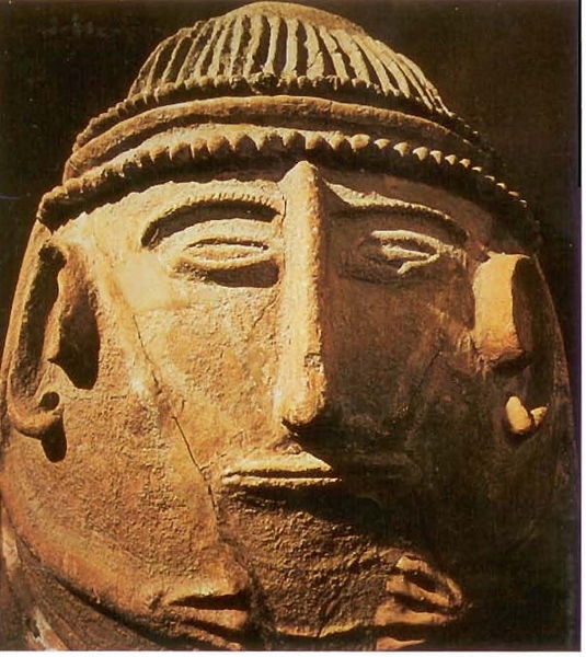 Around the same time as some of the sea people started to settle in Phoenicia, the Philistines started to settle in the Levant. They appeared as early as 1,400 BC producing very characteristic “sea people” pottery coffins, some slipper shaped, with lids having a raised decoration of a face and arms. Some depicted their characteristic feathered headdress.