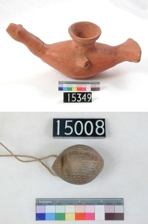 Ceramic vessels were the main component of tomb equipment, mainly containing food offerings. The elite had sacred wooden barges placed in nearby pits for travel in the afterworld. During the first and second Dynasty, pottery vessels were mainly based on pre-existing shapes, and painting was not as common as it became later. Some bowls and plates were produced by pressing a sheet of clay onto a shaped core, trimming, allowing to dry and then firing. Larger vessels had their bases made by coiling, with separate rims that exhibited horizontal parallel lines from rotation. Some cylindrical jars had a lattice design imitating the rope marks made by slings for carrying pots and others the marks of the bands of string used to support pots when drying. Undulating lines modelled into the upper part of cylindrical jars were the final manifestation of the influence on Egyptian potters of wavy-ledge handles on vessels imported from Palestine before 3,000 BC.