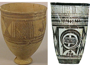 In the 5th Millennium BC in South Persia the potters had developed sophisticated two-stage kilns having a grate and firebricks. The potters of Susa, the major city in South Persia on the south eastern fringe of Mesopotamia, produced many large thin-walled drinking vessels and open bowls from high quality clay at the height of the Ubaid period from around 4,500 to 3,500 BC. They also made small pottery figures of humans and animals. Over 1,000 graves were found in Susa containing three or four items of fine handmade ritual pottery, usually a beaker, dish and small jar. The most richly decorated pottery from this area, remarkable for its fine painting, also came from Susa. The body was grey or buff coloured, coated in greenish slip and decorated in dark colours, often red, with geometric shapes, plants, waterfowl and other partly stylised but easily recognised animals including running dogs, horses, ibex, goats and snakes, as well as stick-like people, usually in friezes. Examples are a very attractive funeral beaker decorated with diamond shapes, zigzags and leaves using black paint on a cream ground, 20cms high, another with buff ground is decorated with stylised ibex having elongated horns forming a sweeping design, together with long-necked water birds near the rim (rare ones have a hunter with bow), both dated to 4,000 BC. A later bowl had dark brown birds, zigzags and triangles on a buff ground. There was a reasonable link with Northern Iran as shown in similar pottery decoration, but there would also have been a link between Susa and Ur at this time. Pottery from Bakun, a simple cattle ranching village but with highly developed crafts located near Persepolis, was influenced by Susa and around 4,000 BC produced vessels with geometric designs and dramatic human figures.