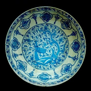 The Abbasid’s very beautiful and sophisticated art tradition spread widely. It caused a great revival of ceramics in Egypt, possibly using migrant potters from Mesopotamia and Persia. New discoveries produced new effects that triggered further developments and new wares. For example, from as early as 700 AD the Iraqi potters had been producing “Basra blue-painted ware” in Basra, but it became associated with Abbasid Samarra. It comprised a buff/yellow fired body, a rediscovered white tin-opacified glaze and a further glaze layer containing cobalt blue.