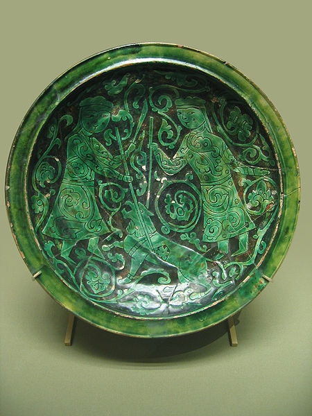 In the 10th and 11th century a Persian example of this ware, known as Guebri, had a red body covered with a white slip, covered with a transparent green or yellow lead glaze. Typical motifs were flowers, animals, including humans, and bold inscriptions. “Lakabi” wares were also developed in the Middle East. In this method, clay threads were used to outline the design, separating the different coloured glazes, similar to the cloisonné technique. It was not used for long as the colour separation was not as good as with cloisonné.