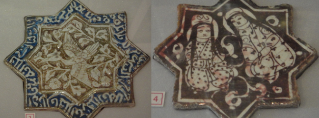 However, Kashan was chiefly famous for lustre-painted tiles, which were distinguished by their fine workmanship, brilliance and design intricacy. They were square, rectangular and interlocking star shapes, each part of a large design, particularly when used for the mihrab or niche in a mosque indicating the direction of Mecca.
