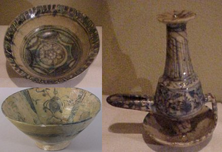 Here the vessels were covered with a cobalt-based light blue or turquoise glaze and the simplified decoration of scrollwork and geometric designs painted in red, black and sometimes white, with much of the decoration executed in gold leaf stuck to the glaze. This developed into a polychrome ware over a rather matt cream glaze. Colours used were blues, turquoise, brownish-red, purple, green, red, black, white and applied gold leaf. Although Soltanabad was a pottery producing area well before the Mongol invasion, it was not until the late 13th century AD that it started to become really important. The Il-Khanids particularly liked rich, sombre colours such as dark blue, grey and black, so Persian potters produced pottery in these colours, especially on relatively thin, whitish bodies at Soltanabad. At the end of the 13th century their potters were producing underglaze wares with designs using radiating wedge-shapes with floral patterns in blue and black under a clear glaze. Another ware is decorated mainly in black paint on a greyish ground, some of the pattern in white low relief, all covered in a clear glaze, usually they were decorated with a central bird or animal and a floral background. The most popular shape was a bowl with splayed foot ring, hemispherical body and everted rim. Further wares had relief moulding under a turquoise or dark blue glaze and others with black slip under a transparent turquoise glaze. Probably originating in Syria, a new vessel shape appeared, the albarello, or drug jar, that became popular in Italy.