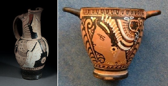 The Etruscans are also noted for decorating their pottery vessels with relief ornamentation by rolling the soft clay with a cylinder having the “negative” design recessed in its surface (a roulette). The principle is similar to the Sumerian cylinder seals. They also stamped decoration onto the leather-hard body, using wood or ceramic stamps, sometimes using “oriental” style fabulous animals. They produced vases with covers in the shape of a human head with arms threaded through fixed ring handles. These were used for funerary purposes until the mid-6th century BC. At about this time they also adopted the Greek black pigment to paint their pots.